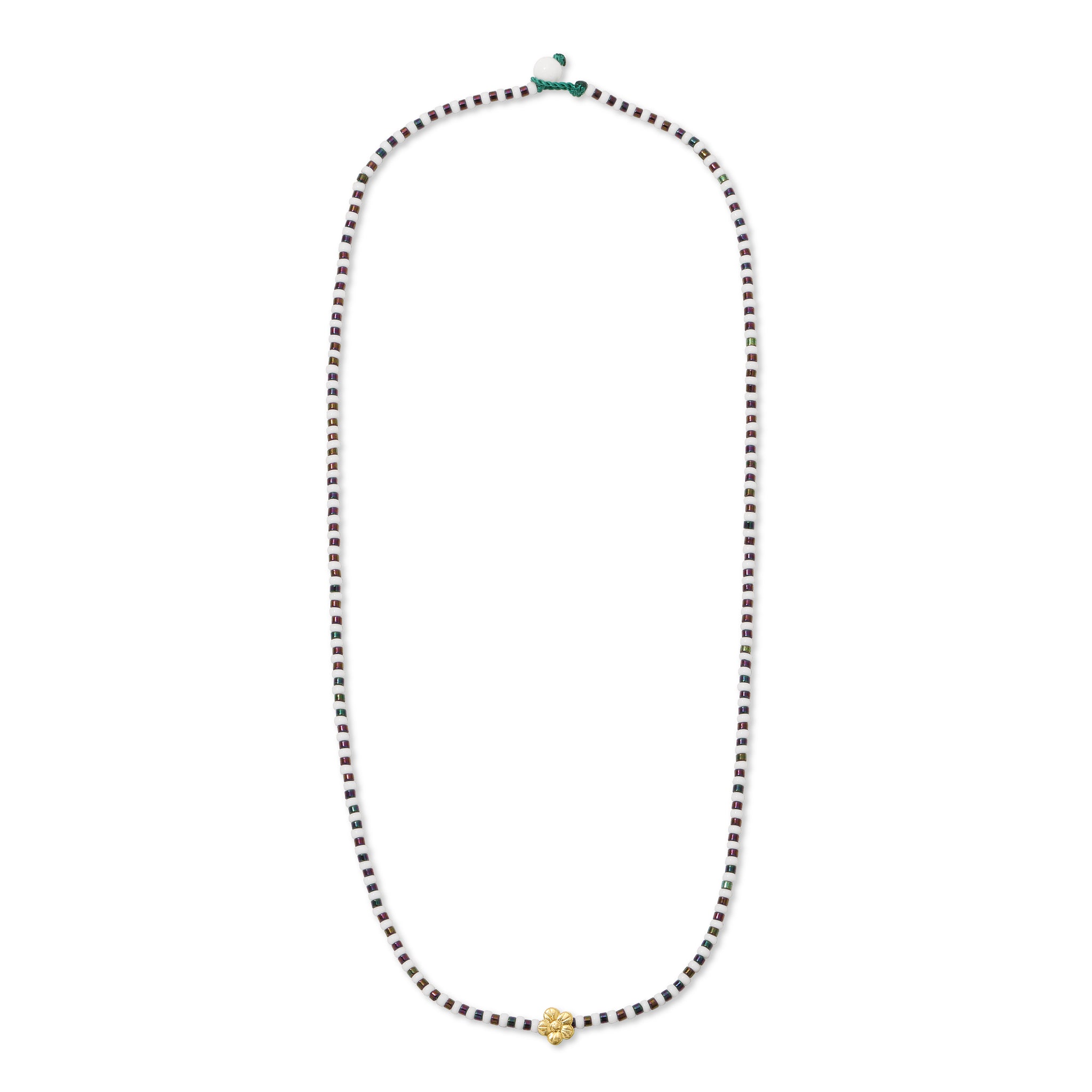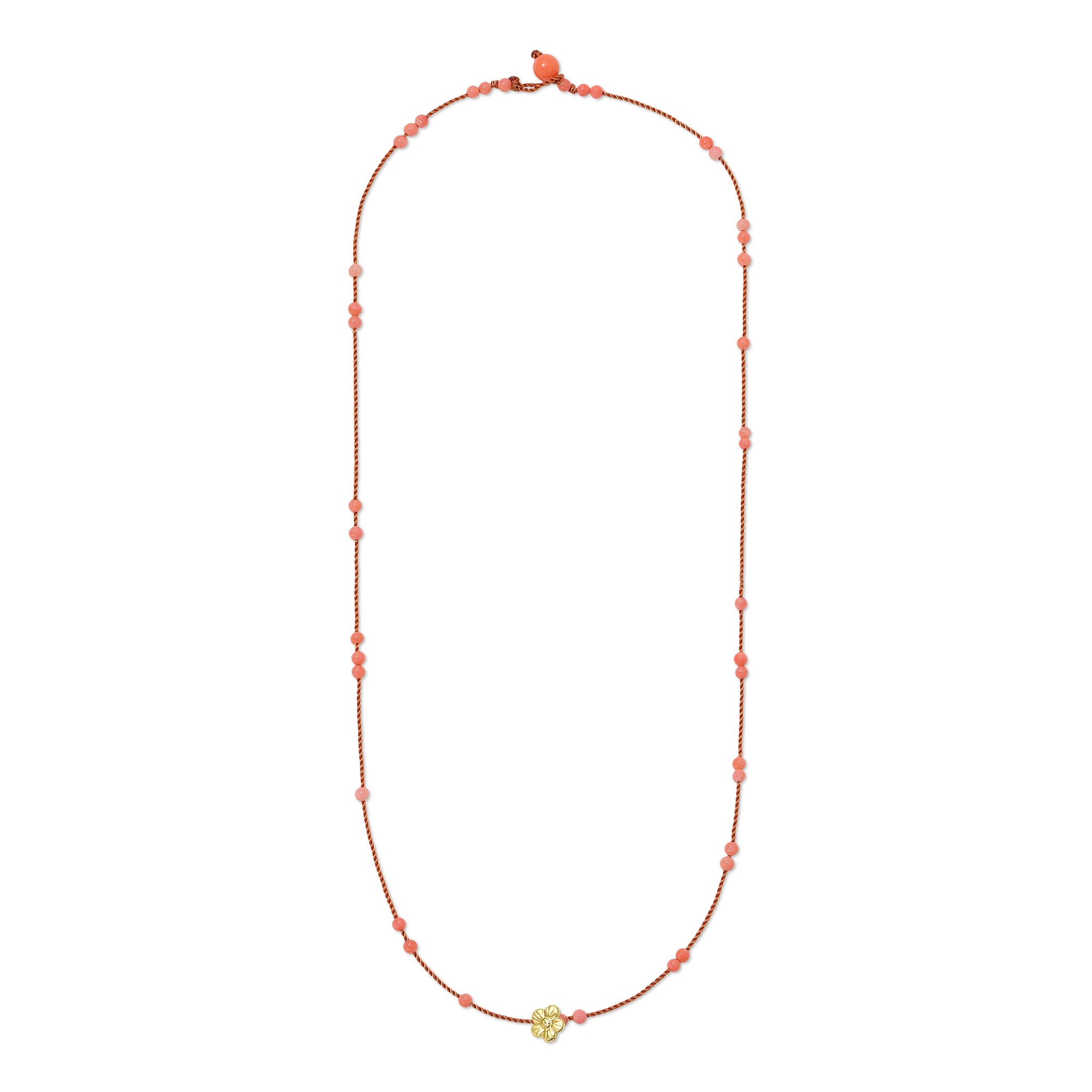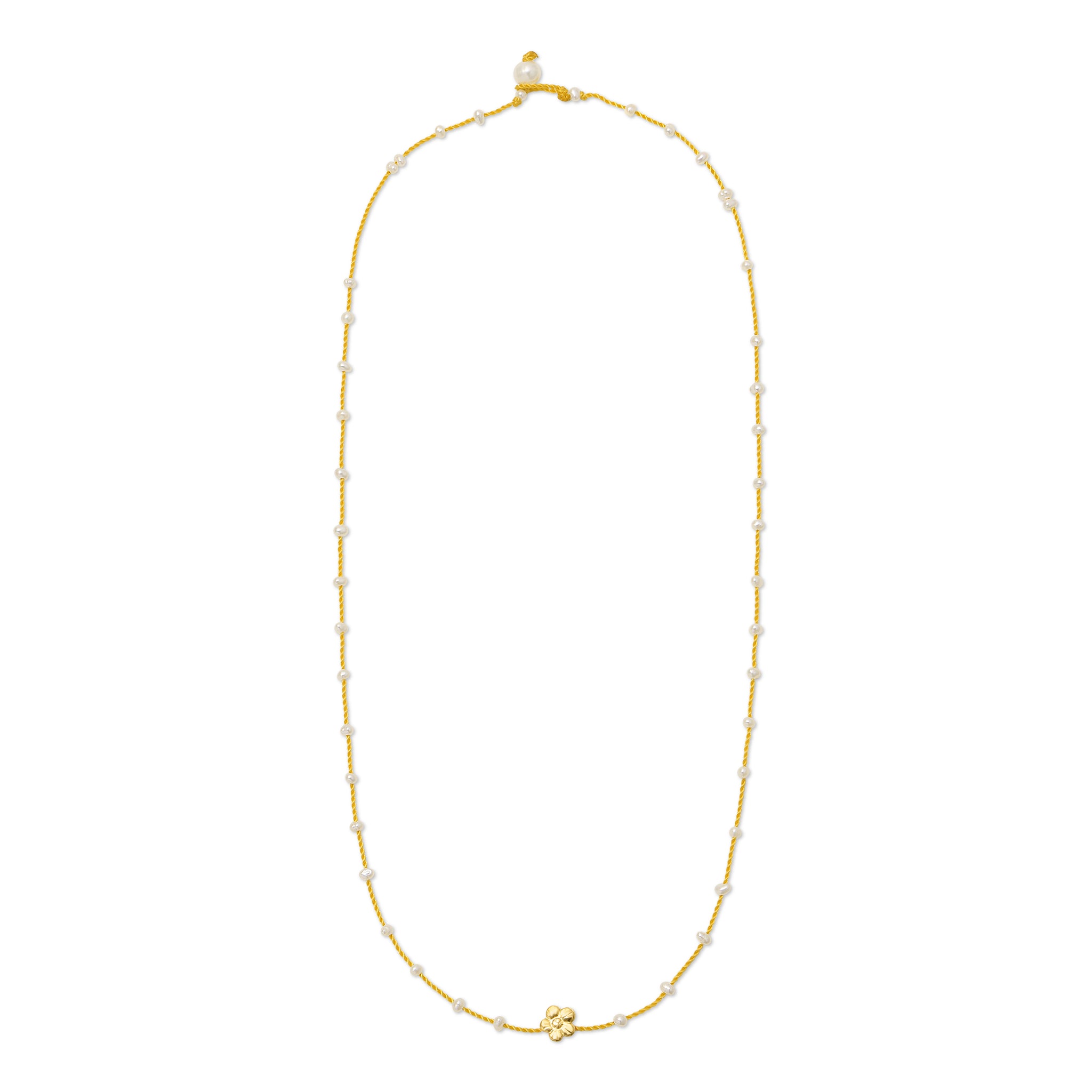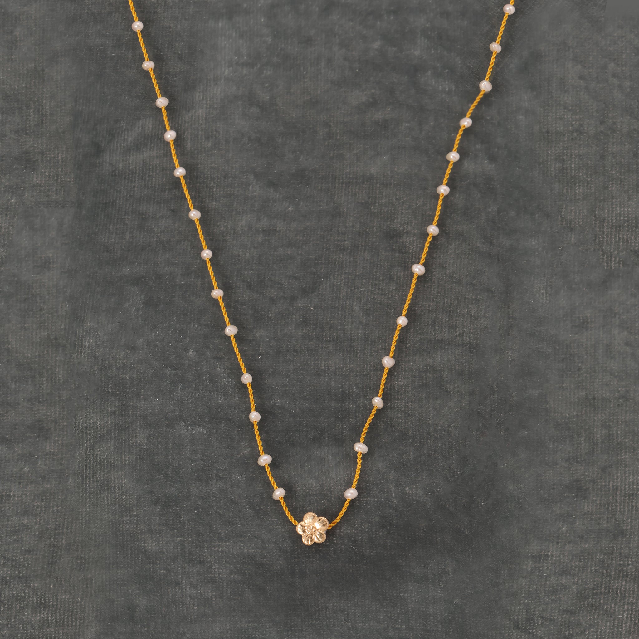 “Fleur” Necklace (Flower in French) – A delicate bloom in 14K solid yellow gold, accented with tiny 2mm white pearls for a fresh, elegant touch. Perfect for spring, it comes on an ultra-water-resistant nylon cord in mustard, copper, brown, emerald, or baby pink—chic, effortless, and made to be worn every day.