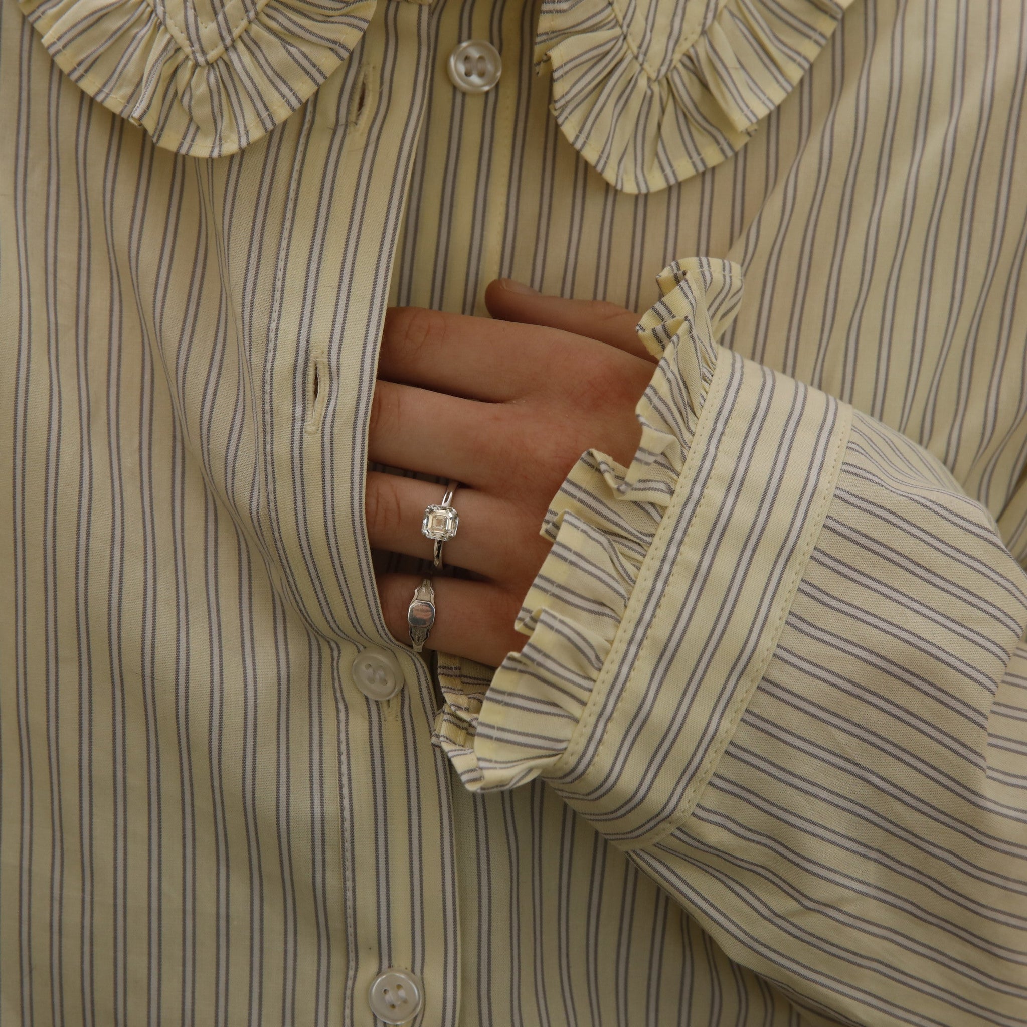 A romantic solitaire with old-world charm, featuring a 1-carat Asscher lab diamond nestled in four triangular prongs. Select sterling silver with rhodium plating or 18K solid yellow gold for an heirloom aesthetic. Combine with the Plume signet ring for a sophisticated, vintage-modern pairing.