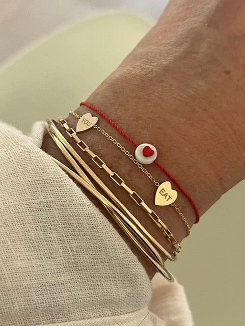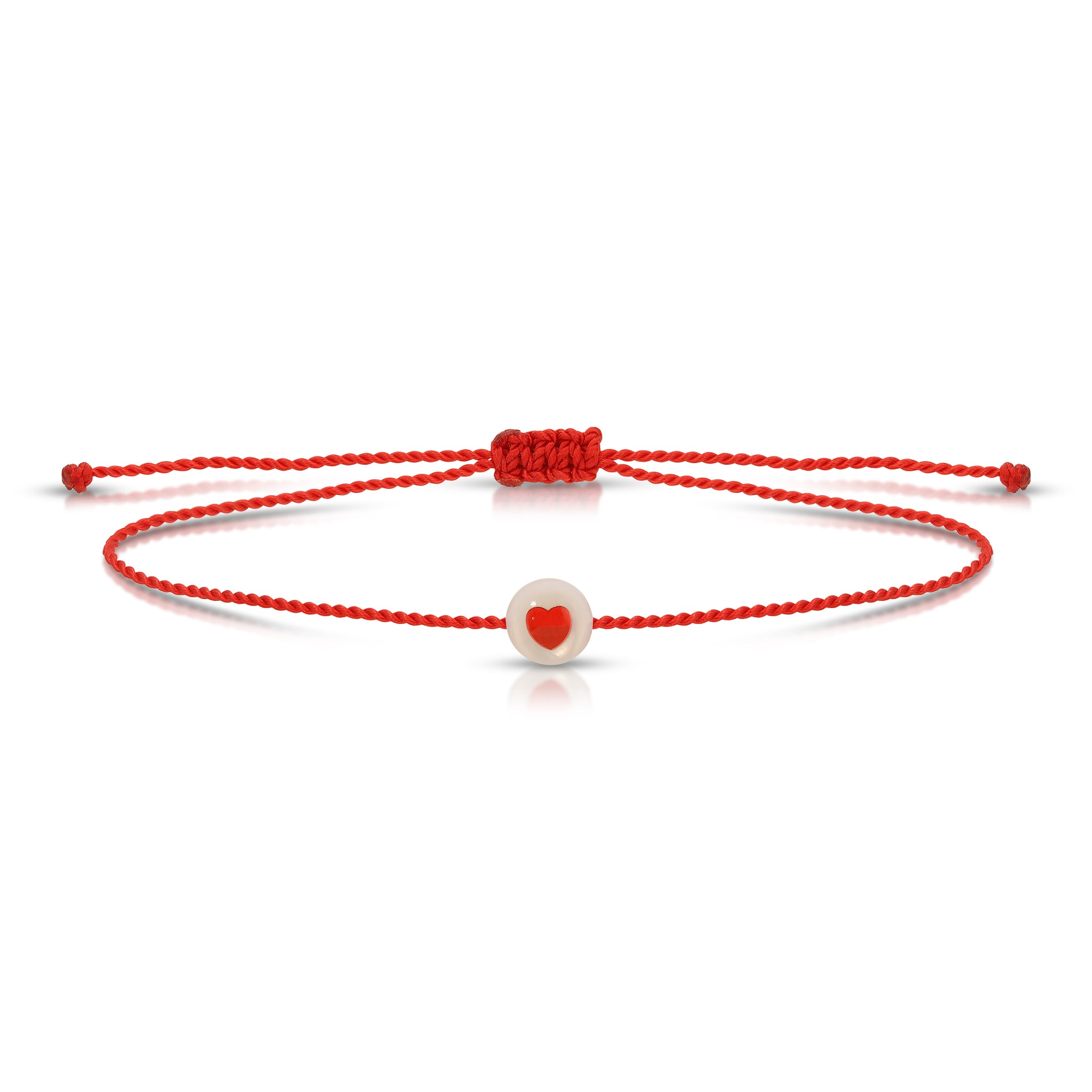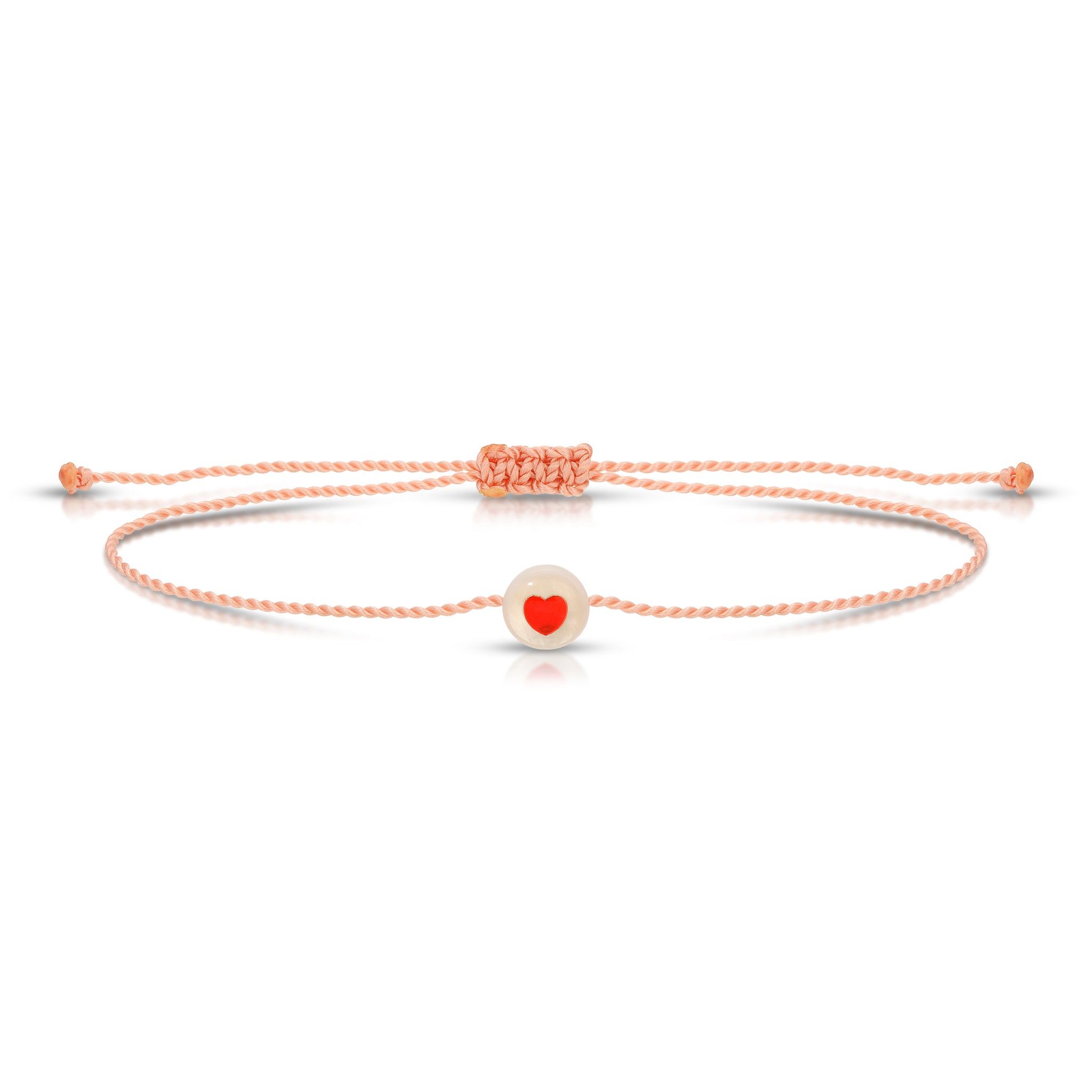 The Crush cord bracelet is a sweet yet striking piece featuring a delicate mother-of-pearl bead adorned with a vivid red heart, strung on an adjustable nylon cord in baby pink or classic red.